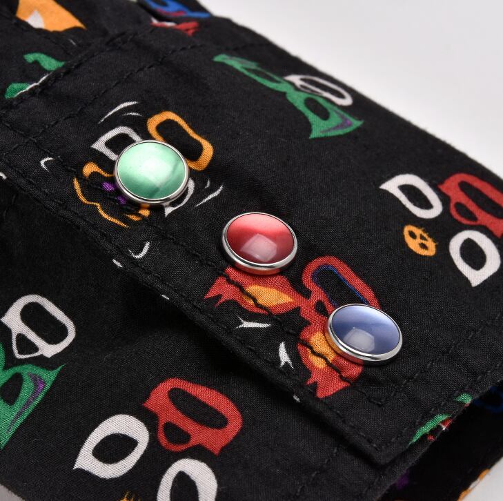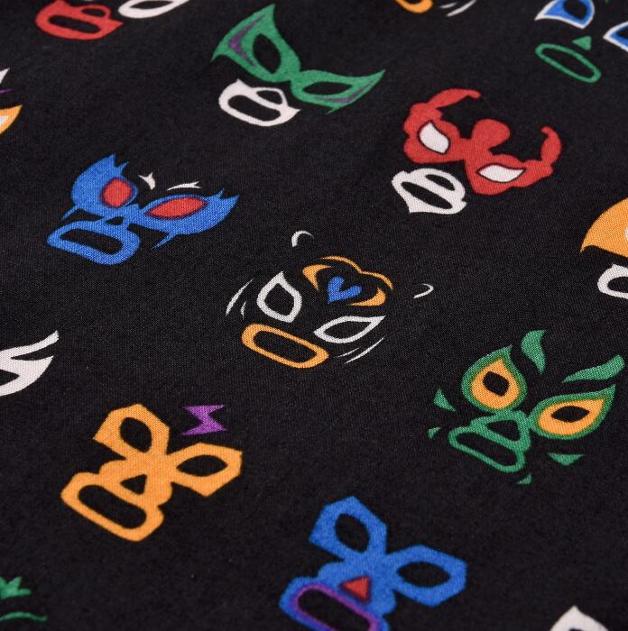 ショルダーやアームホール、脇下から裾などの負荷のかかりやすい部分にはトリプルステッチが施されており、さらに裾部分の補強にガゼットが取り付けられるなど耐久性にも配慮しています。生地に合わせてセレクトするスナップボタンや金具など、オリジナルデザインのヨークやポケットはFUNNYオリジナルの最大の特徴です。ルチャリブレのコミカルなマスク柄プリントとそれにマッチしたマルチカラーのスナップが見ているだけでも楽しい気分にさせてくれます。